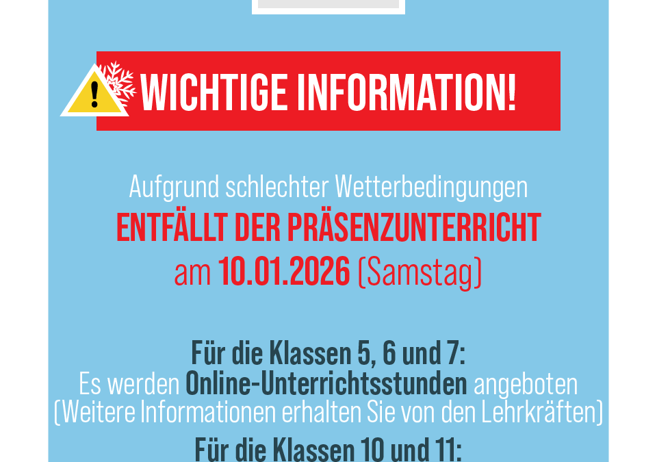 November 16, 2025Aufgrund schlechter Wetterbedingungen ENTFÄLLT DER PRÄSENZUNTERRICHT am 10.01.2026 (Samstag)